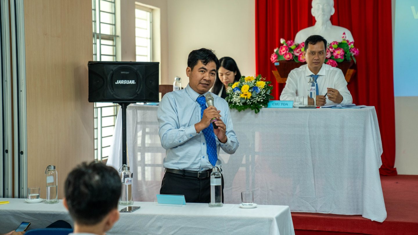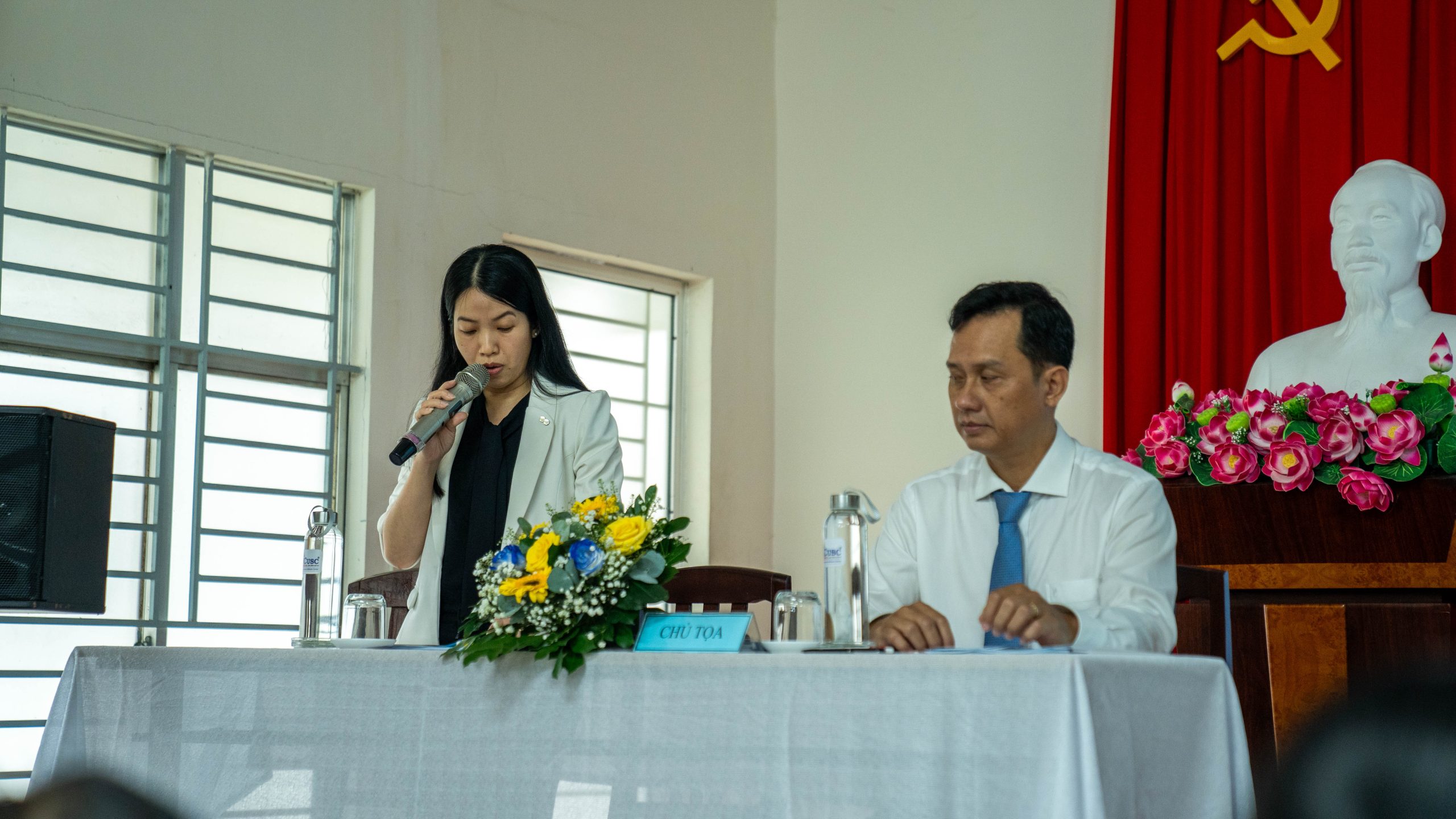 Tiếp theo, cô Văn Thị Xuân Hồng, Chủ tịch Công đoàn, phát động phong trào thi đua trong năm học 2025-2026. Cuối cùng, cô Trần Thị Ngọc Liễu thay mặt cho Ban Thư ký Hội nghị trình bày Dự thảo Nghị quyết Hội nghị. Nghị quyết Hội nghị đã được thông qua với 100% đại biểu Hội nghị nhất trí với nội dung của bản dự thảo.