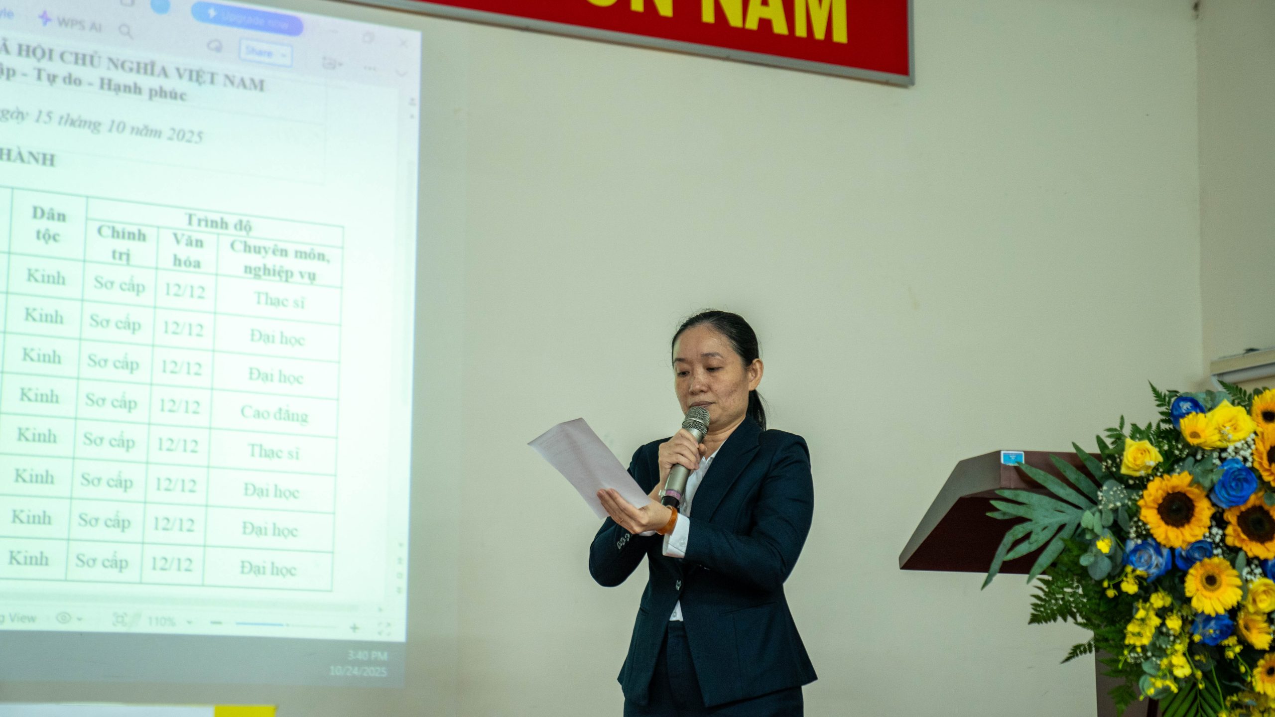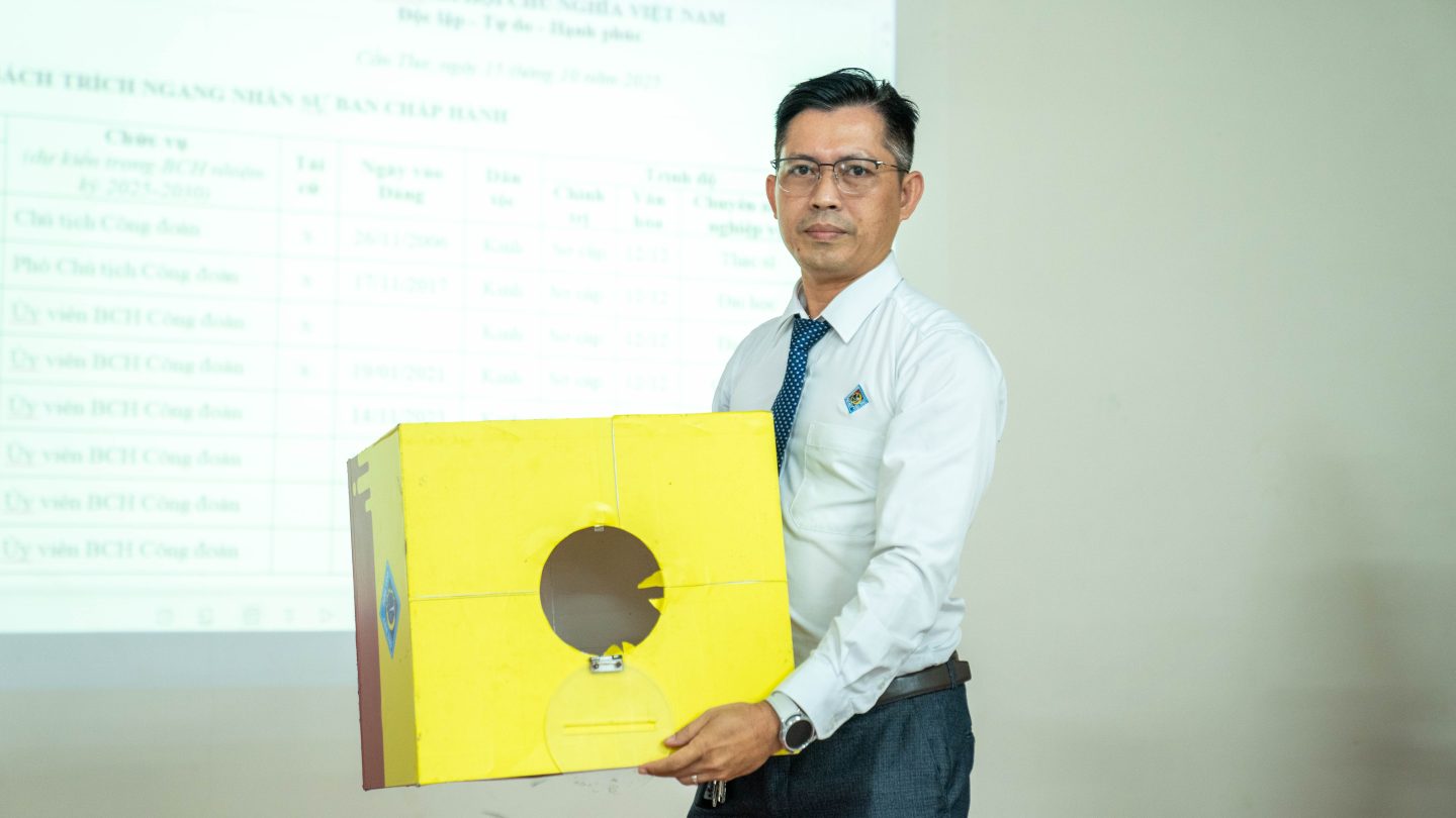 Cô Trần Thị Hồng Ân, Trưởng ban bầu cử, hướng dẫn nguyên tắc, thể lệ bầu cử và trình thùng phiếu trước khi tiến hành bỏ phiếu. Các đại biểu Đại hội tiến hành bỏ phiếu bầu ra 07 thành viên trong Ban chấp hành Công đoàn nhiệm kỳ 2025-2030.